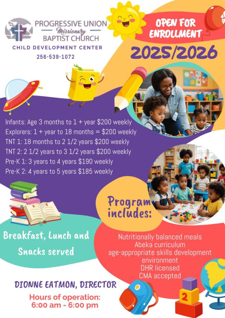 Progressive Union Child Development Center strives to serve our families with excellence, providing quality education and childcare that is competitive with other Christian Child Development Centers throughout Huntsville, Alabama.